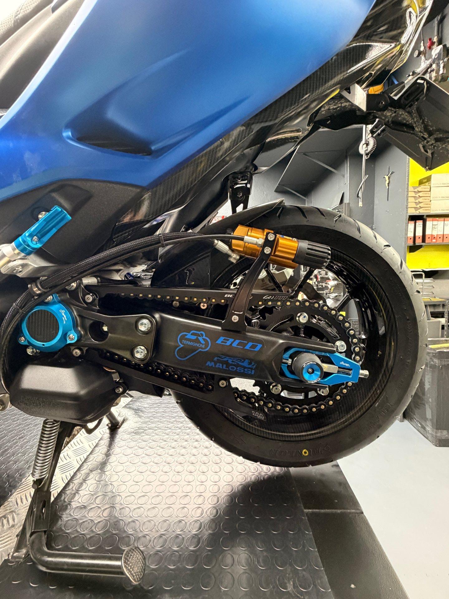 Il KIT CATENA è progettato appositamente per il T MAX 560 2020-2025, permettendo di trasformare la trasmissione originale in un sistema racing a catena.